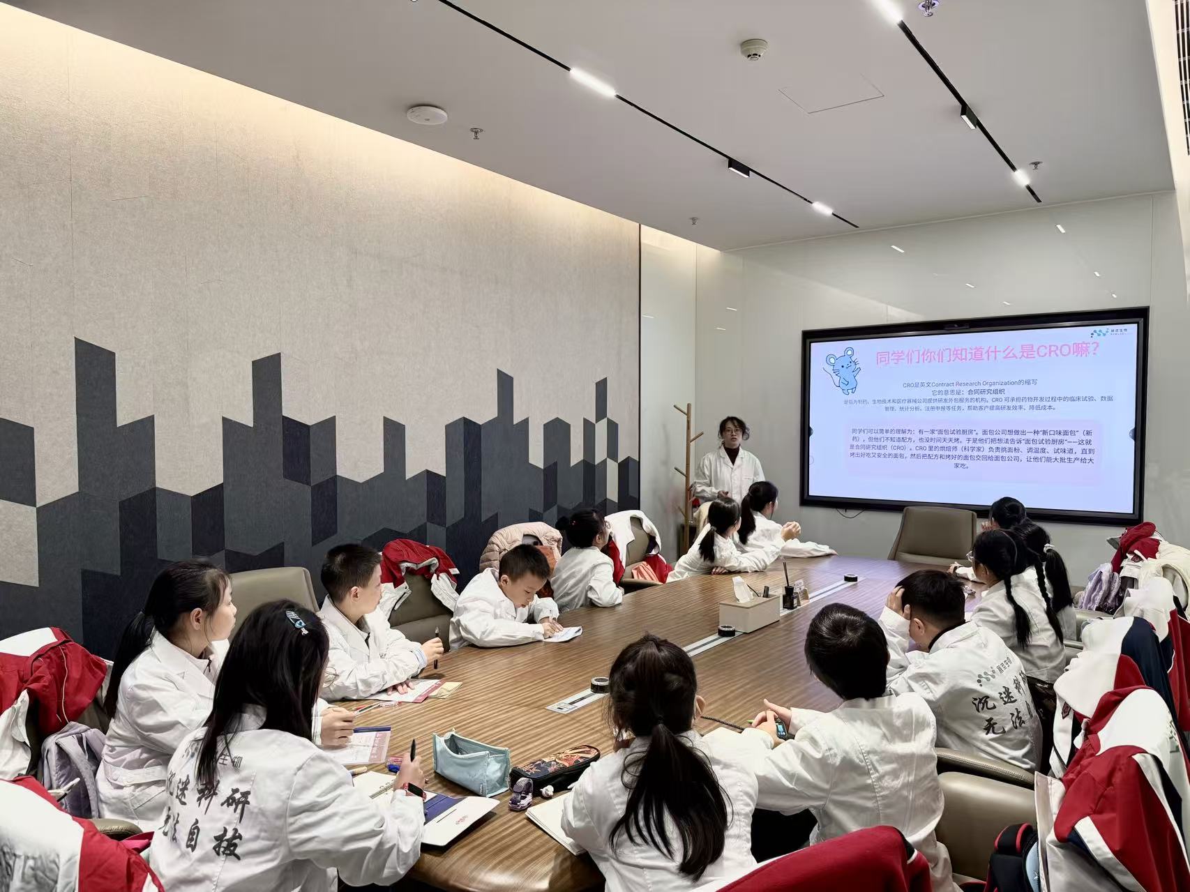 随后的岗前培训环节,同学们在展鸢生物迎来了干货满满的“探秘CRO科学星球”科普课堂。专家老师以贴近引导、寓教于乐的方式,剥开复杂术语的外壳,揭示了实验动物作为“人类健康先锋”的重要使命。同学们思维活跃,接连抛出充满探究欲的问题,展现了新一代青少年对科学领域的深度求索。