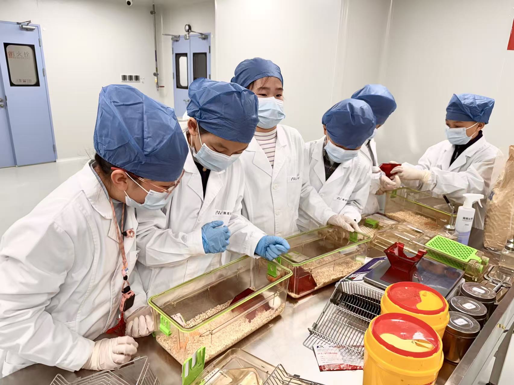 整个体验中最具挑战性的实验员工作实践随即展开。在科研人员的指导下,同学们先是化身“星级厨师”,给实验小鼠们换上干净的水和特制的“营养饼干”,接着又变身清洁大师与健康观察员,给实验小鼠换上干净的“床铺”,并观察每只小鼠的状态,学习体验了小鼠的称重操作。专注的神情与谨慎的态度,仿佛他们已是这个科研团队中正式的一员。