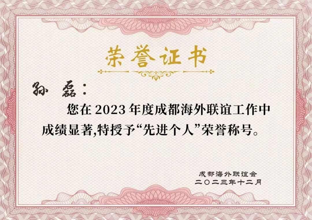 会议传达学习了党的二十届二中全会精神及省委全会精神,审议通过了成都海联会第七届理事会近一年工作报告和相关人事议题,为新任名誉会长、副会长、副秘书长、常务理事和理事颁发聘书,为2个先进集体和21名先进个人颁奖。其中展鸢生物科技(成都)有限公司联合创始人孙磊当选为成都海外联谊会第七届理事会副会长,并被授予成都海外联谊会2023年度“先进个人”称号,所在的青年委员会荣获2023年度海外联谊工作“先进集体”荣誉。