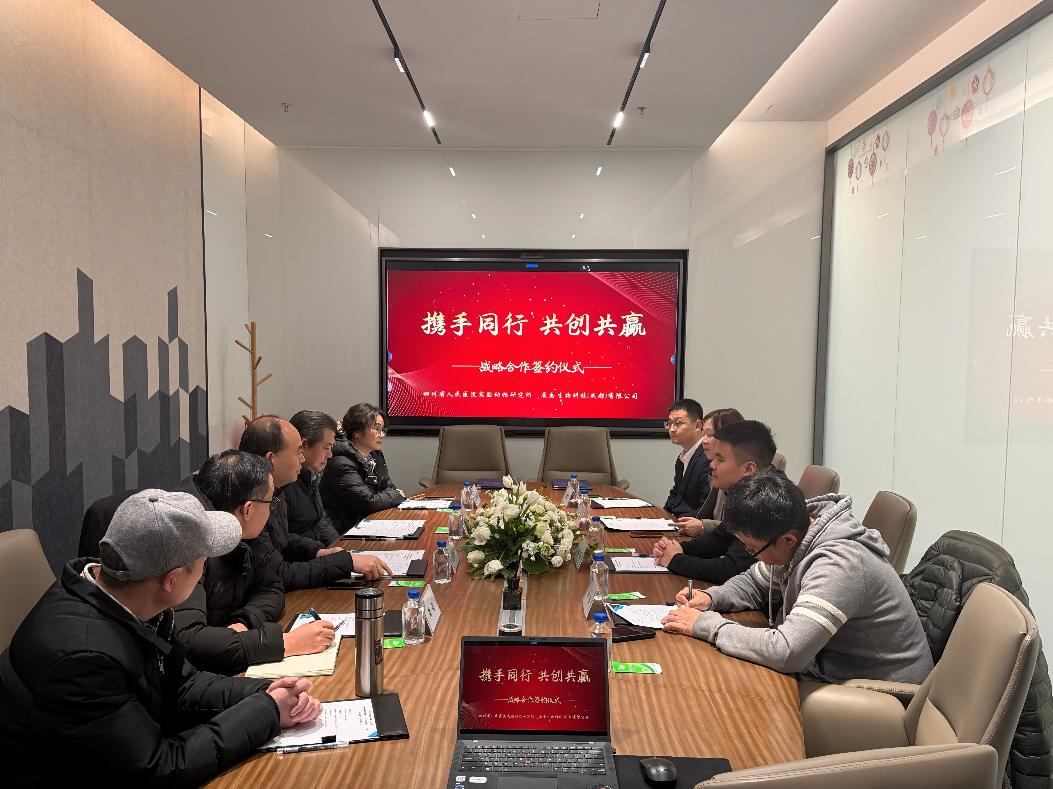 2026年1月22日,四川省医学科学院・四川省人民医院实验动物研究所与展鸢生物科技(成都)有限公司战略合作签约仪式暨项目交流会在展鸢生物会议室隆重举行。双方秉持 “协同共享、价值共创、发展共进、互惠共赢” 原则,正式确立长期稳定的战略合作伙伴关系,携手打造生物医药临床前研究创新平台。